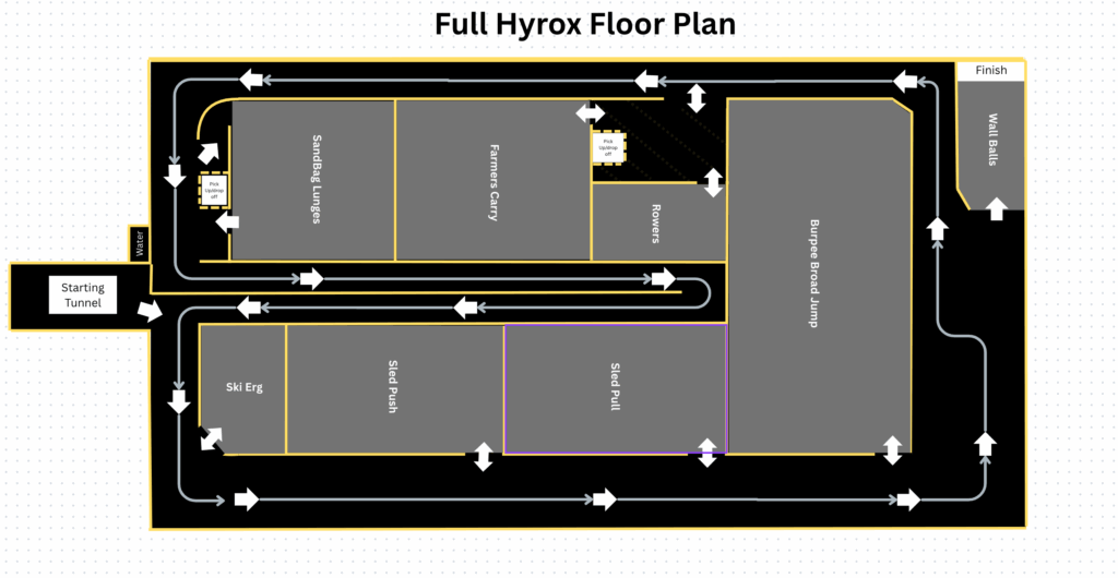 The Hyrox race consists of an alternating sequence of a 8 x 1km indoor run and one functional workout station after each run.
