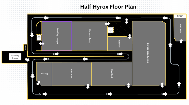 The Half Hyrox event is a scaled-down version of the full Hyrox race, consisting of half the length of each workouts.