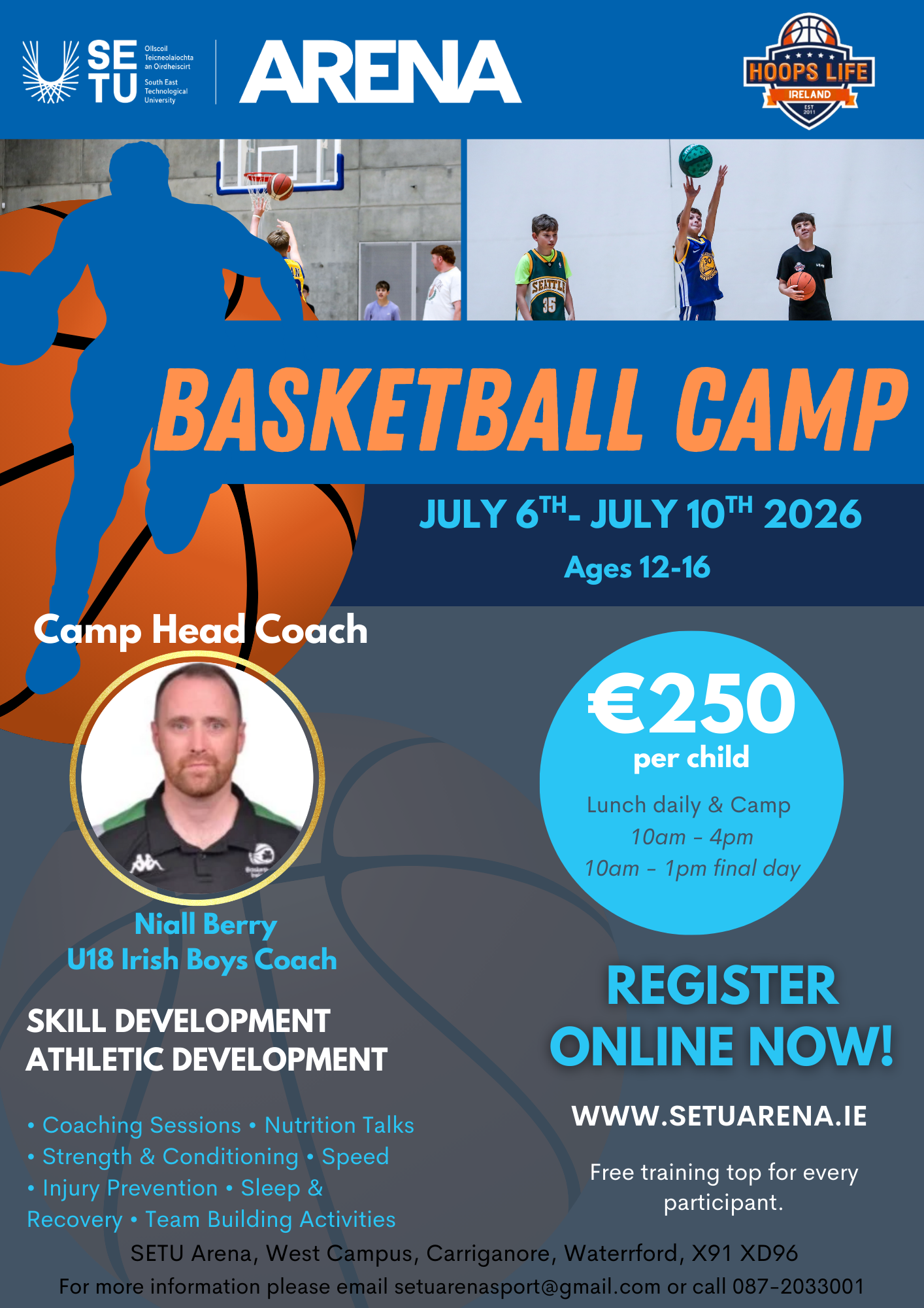 The SETU Arena & Hoops Life Academy Basketball Camp is taking place from July 6th to 10th July 2025. This is a developmental camp for children aged 12-16.